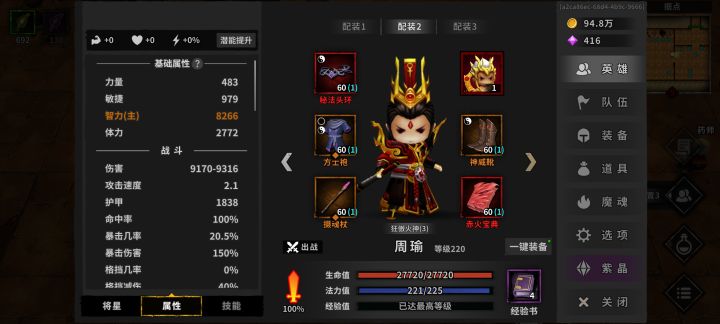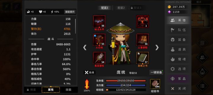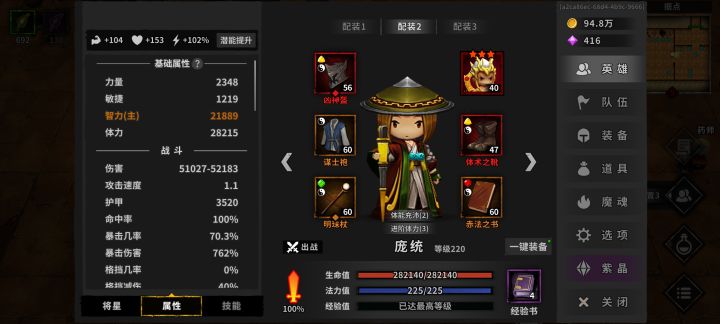像标题所写,玩时候各种看群看论坛,看别人乱七八糟的攻略,用得着的用不着的,走了很多弯路,现在写出来,给玩的懵逼的你们攻略乱七八糟的,现写一份速通的,自己打世界石的时候,看什么无限庞统,火夏侯乱七八糟的,都是弯路。现在教你们暴力过九周,真男人从不防守。体火暴力过关。庞统,唯一主C,装备三体力,两体能,体能和体能加成的装备首选。有没有智力无所谓,但要两个小词条,迟缓的冰冻,自己凑暴