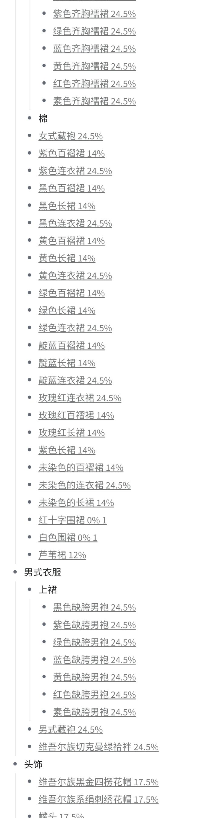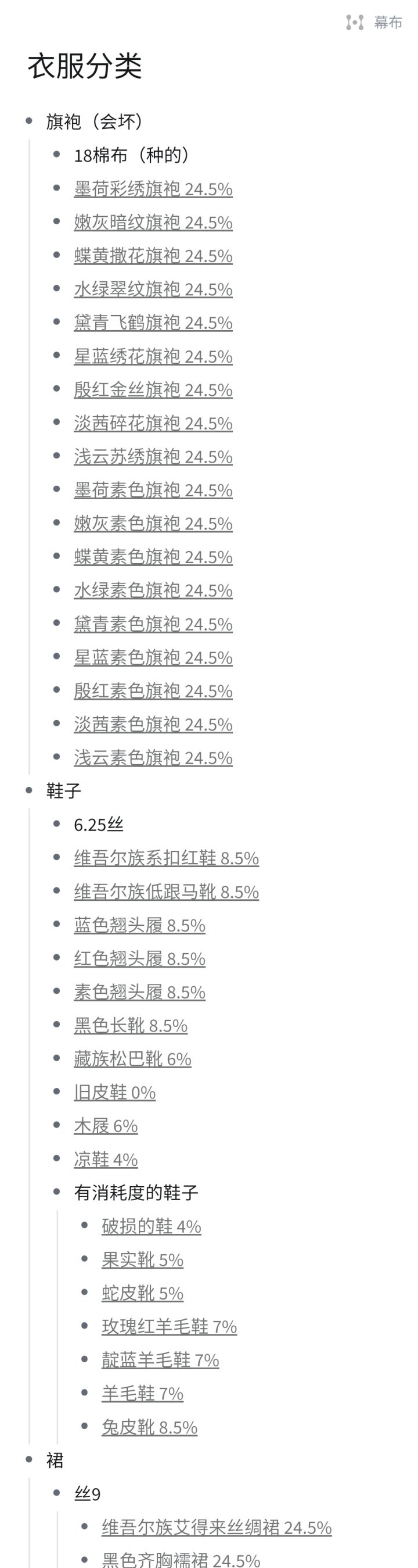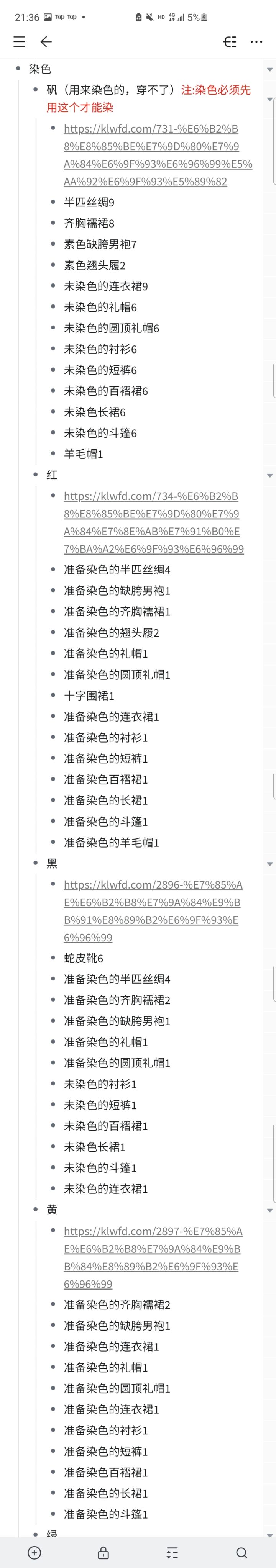 做衣服做得头疼,自己写了篇(自用的,希望能帮助到大家)提前把染色的物品放染料旁边,避免误染,少染。(怕搞混的可做完打勾)染色攻略暮布地址:衣服分类地址:有什么不对或缺少地方欢迎指正和补充。【第一次做华夏攻略会有缺斤少两的情况出现(小声逼逼¦•ˇ3ˇ•。))】