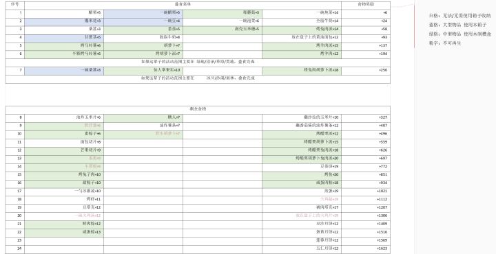 主楼分享一下食谱食谱使用步骤:①女娲重生②抱冰淇淋/雪球③饥饿BGM响起,开始吃第一行。④吃完一行撞一下蚊子。为方便解释,“增加食格≤13的食物“称为”小食物“,”增加食格>13的食物“称为”大食物“。如果想要替换食物,每一行只要所有小食物相加≤13就可以,大食物可随意替换。