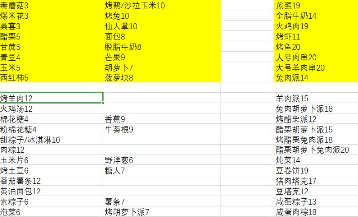 给大家分享一个自创贫富皆宜的食谱,从高到低越来越难获得,食物不重复,可以分开用也可以合起来用,有时候想随机做点什么食物用这个叠食表正好,包含所有食物不包括素饺子,猪肉虾仁饺子,月饼(成本太大),送给有需要的小伙伴们。叠前食物用不能撞蚊子后叠食一次的食物充当,比如烤兔吃完了,可以用爆米花,全脂牛奶当叠前食物,桑葚吃完了,可以用仙人掌,火鸡肉当叠前食物。这样消耗叠前食物随机,不用一直临时准备食物,准