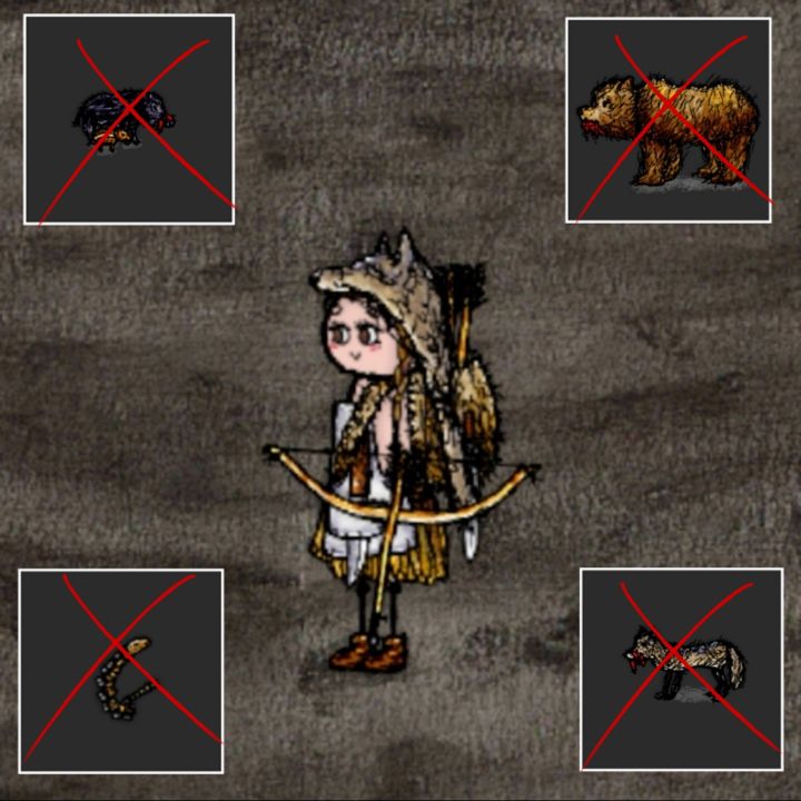身为玩家的你有没有被不知道哪个手欠小朋友掏出来的熊熊🐻、隐匿在大片榕树柳树后面的野猪🐗、铁矿守卫者野狼🐺或者埋伏在名贵染料附近的响尾蛇🐍咬到断档的经历呢?报仇的时刻到了!!!拿起手中的武器一起来愉快地打猎吧~首先我们拿温顺的小动物们练练手。拿尖石削出一根长直木棍,在雪地里找到海狗,打昏它,用燧石片把皮剥下来披身上可以保暖。用尖石把长直木棍削成标桩绑绳子上获得陷阱,到黄草地上抓兔子,兔皮缝个背