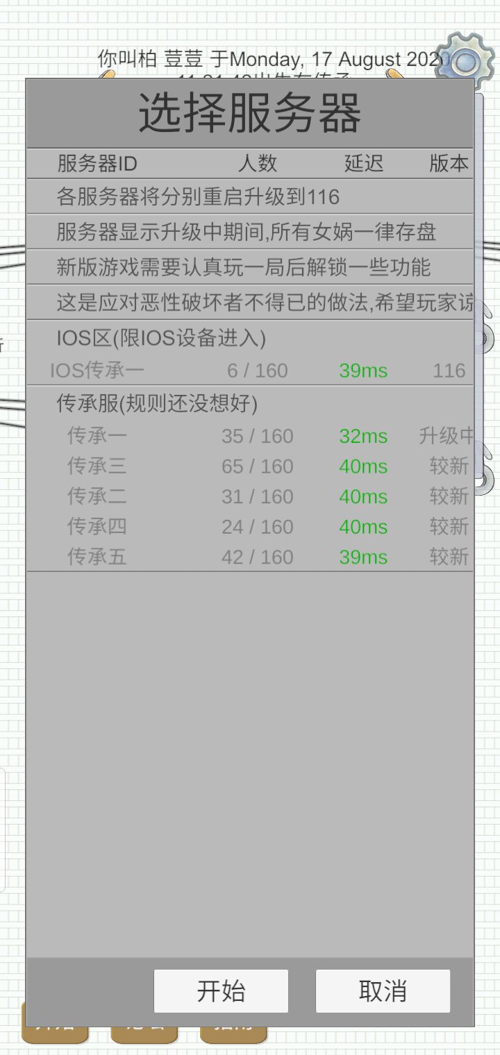 我这个更新了但是服务器是灰色的,点不进去,求解答。还没有全部更新的时候我在一服开了一局我一个闺女说要玩完整的一局,我那一局就是玩到老死的啊,出来还是玩不了?为啥呀?求解答