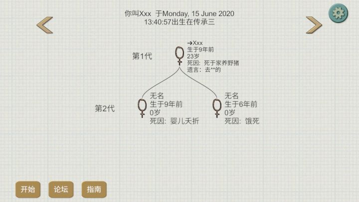 哎呀妈呀!我又断档了!这次我就纳闷了,我怎么不知道我洗4个碗的功夫,才40岁的我那么容易饿死!!!!而且没有我死亡的记录这是我上一次老死的记录,断档的这一次没有记录