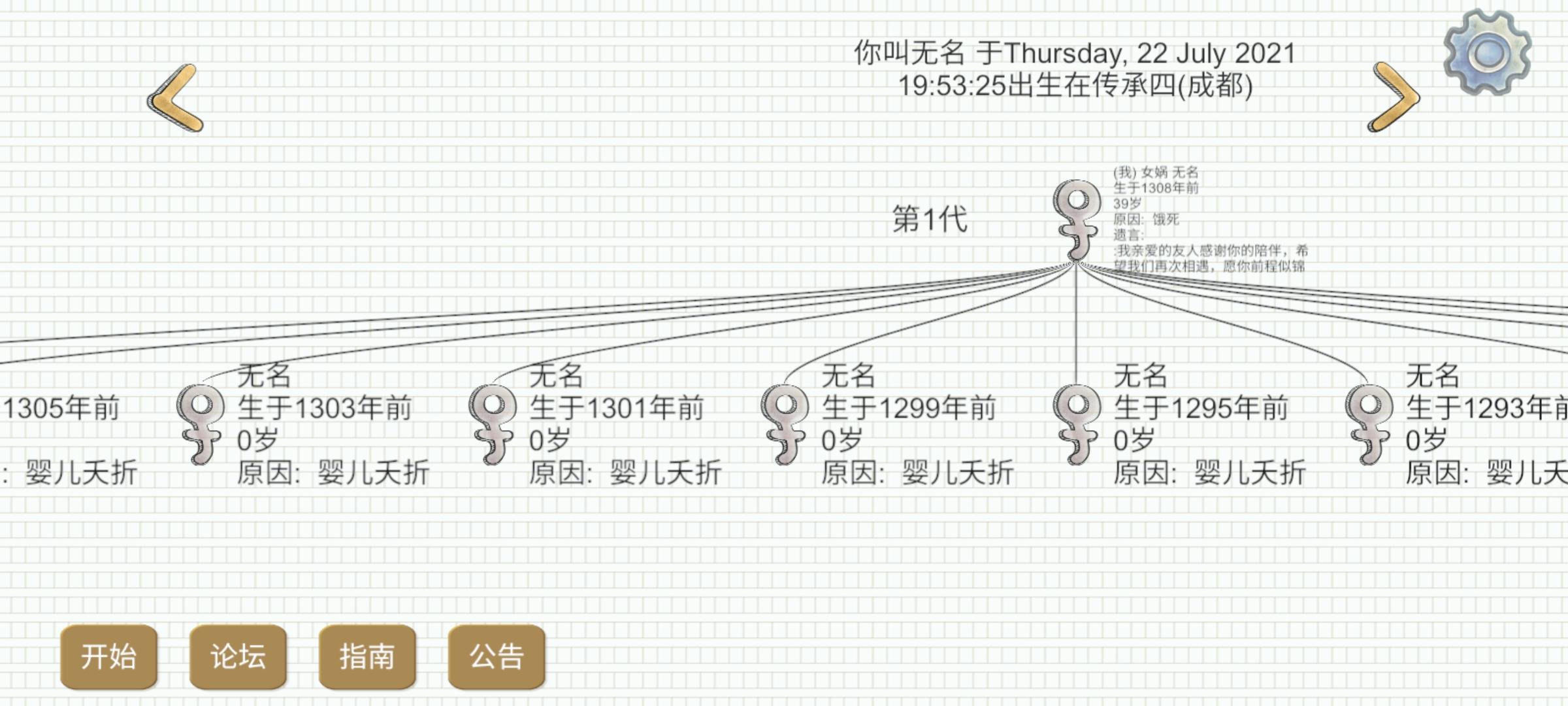 传四,开局遇到另一个女娲,第一世就分开了。后来自己玩,有养娃(好的坏的)给可爱的宝做墓碑,玩了快4天。上个厕所没带手机出门就饿死了…( ˙˘˙ )…太逗了我都忘了手机上还挂着游戏,太懒了,也不肝了。我做了好多衣服。没围墙路过的女娲或者天降的都随意吧,我一个人玩太无聊了( ˙˘˙ )倒是喜欢投胎他聊聊天,我记得人都做了墓碑,感谢那个教我做纸张的小姐姐。我好像能懂了投到哪家,养我我就玩的想法,一个