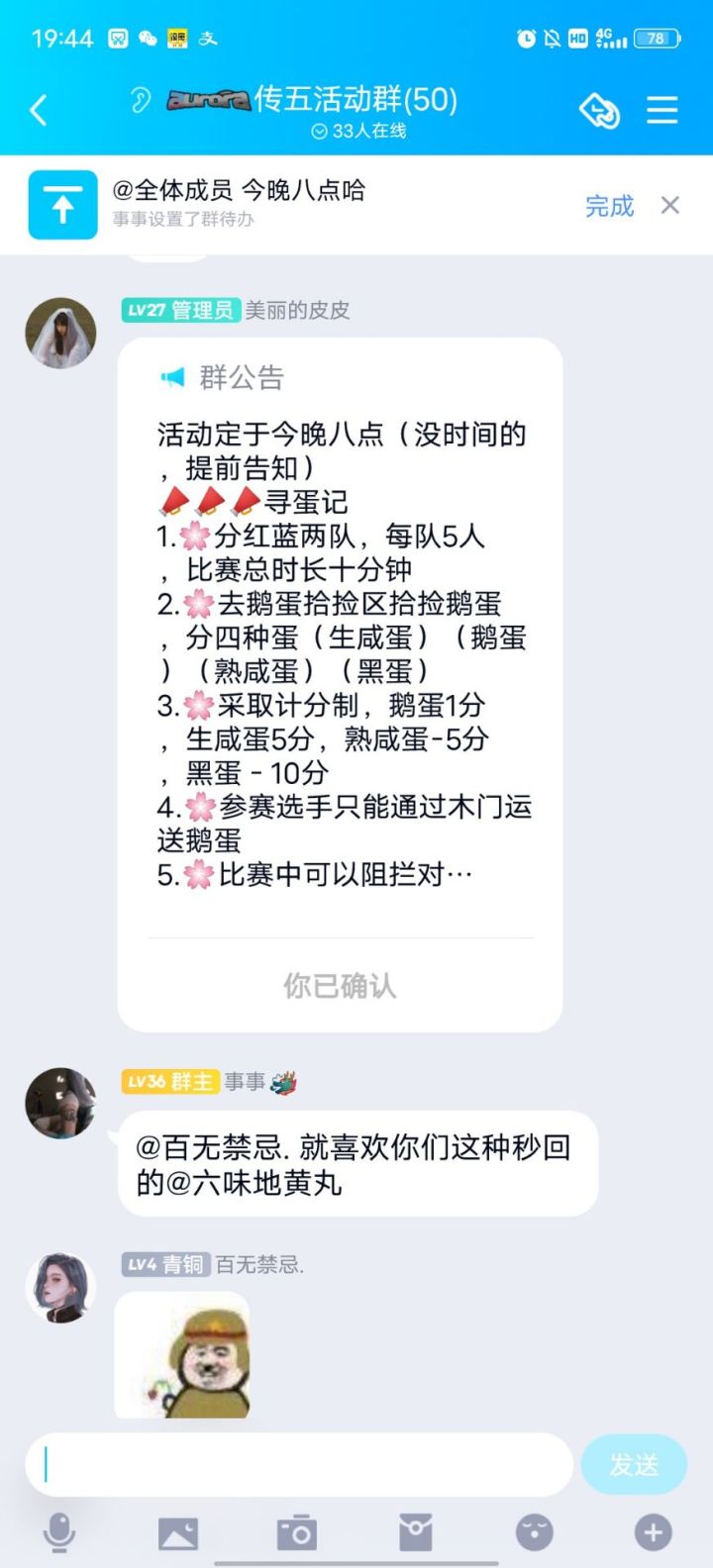 传五事事举办的活动,捡鹅蛋大赛。第一次参加活动,感觉好好玩。 哈哈哈我还跟林菱说让她改名叫辣辣混淆视听当游戏开始我连自己的队友都不知道在哪。。中间几分钟都没有蛋了不知道干啥了。 我看有人往我们队的塞黑蛋我也塞。忙的不亦说乎。。结果犯规了。 哈哈哈哈太懵了,玩的真开心!!谢谢事事皮皮,下次有活动我还要参加😇😇