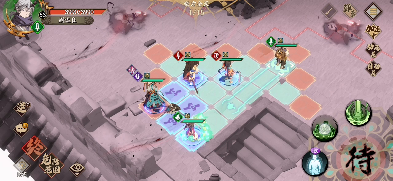 这是我的技能配置跟阵容韩无砂就是A小怪提供战阵,喷吐回合去AOE一下,晕的回合上BUFF。冰拳回合提前控制小狐狸血量闪避骗拳,韩无砂跟封铃笙离开BOSS范围。喷吐是葛云衣跟皇甫申吃,主意站位有可能喷完减速走不出AOE。最后经过这次战斗我发现了一个被誉为蹩脚鸡肋饰品的高光用法这个饰品的好处是狐狸骗完冰拳会被减魔防,闪完下一个回合回首掏满血也有可能死的,但是加了免伤就可以苟活下来,毕竟剩下一丝
