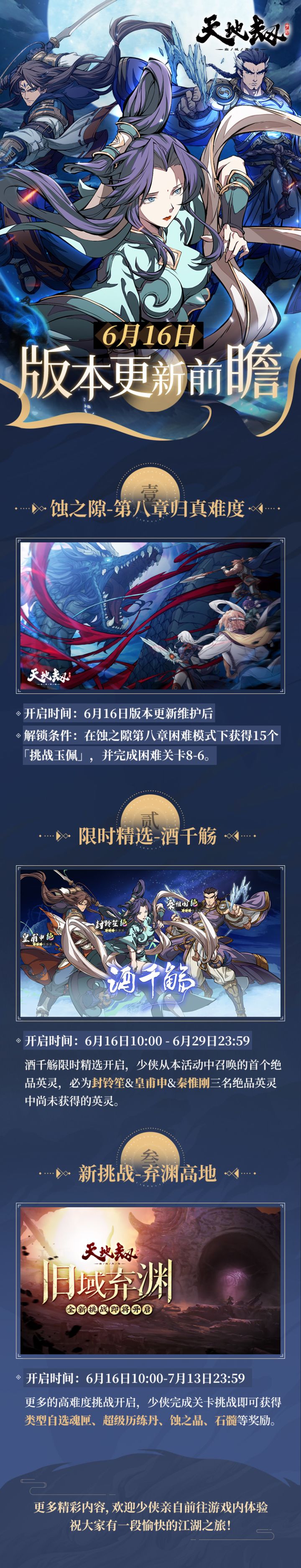九州大陆灵脉动荡,蚀之隙里硝烟渐浓,最新归真难度开启。时轮衡动现出昔日红颜,又有两位英灵回归时轮召唤。愿少侠以情义为帆,借智勇作桨,纵横时光助推的汹涌巨浪。01 蚀之隙·第六章归真难度灵兽冱蚑、黑龙解臾,在这方寸之地中强敌云集。宿命的踪迹指引着前路的方向,幽煌之内,究竟暗藏着何等惊天玄机?活动时间:5月20日版本更新维护后解锁条件:在蚀之隙第六章困难模式下获得15个「挑战玉佩」。02