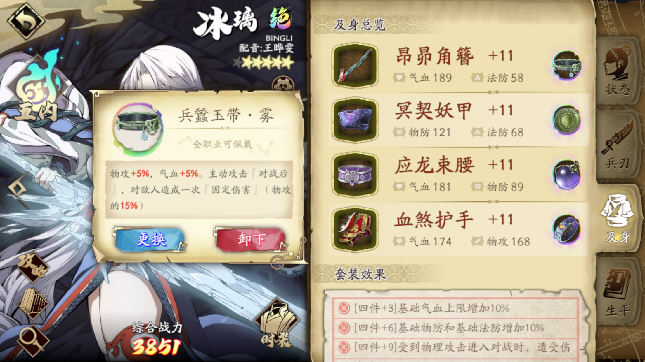 在天地劫中,韩千秀魂石搭配首推“头狼”。本身现在韩千秀就靠aoe、燃烧被动、战阵被动打伤害,对于魂石的加伤要求没有那么高。提高机动性的同时可以在比较安全的距离使用aoe,也更方便跟上阵容的脚步,始终要站在铁卫身边。别的魂石需要进入战斗中的都不推荐,可以考虑别的角色身上替换下来的罗鬼和赤练鬼。饰品推荐,“衣服”和“腰带”优先选择物防,羽士主要怕的也是近战输出,怕物攻;“头盔”和“手臂”有加物攻的就