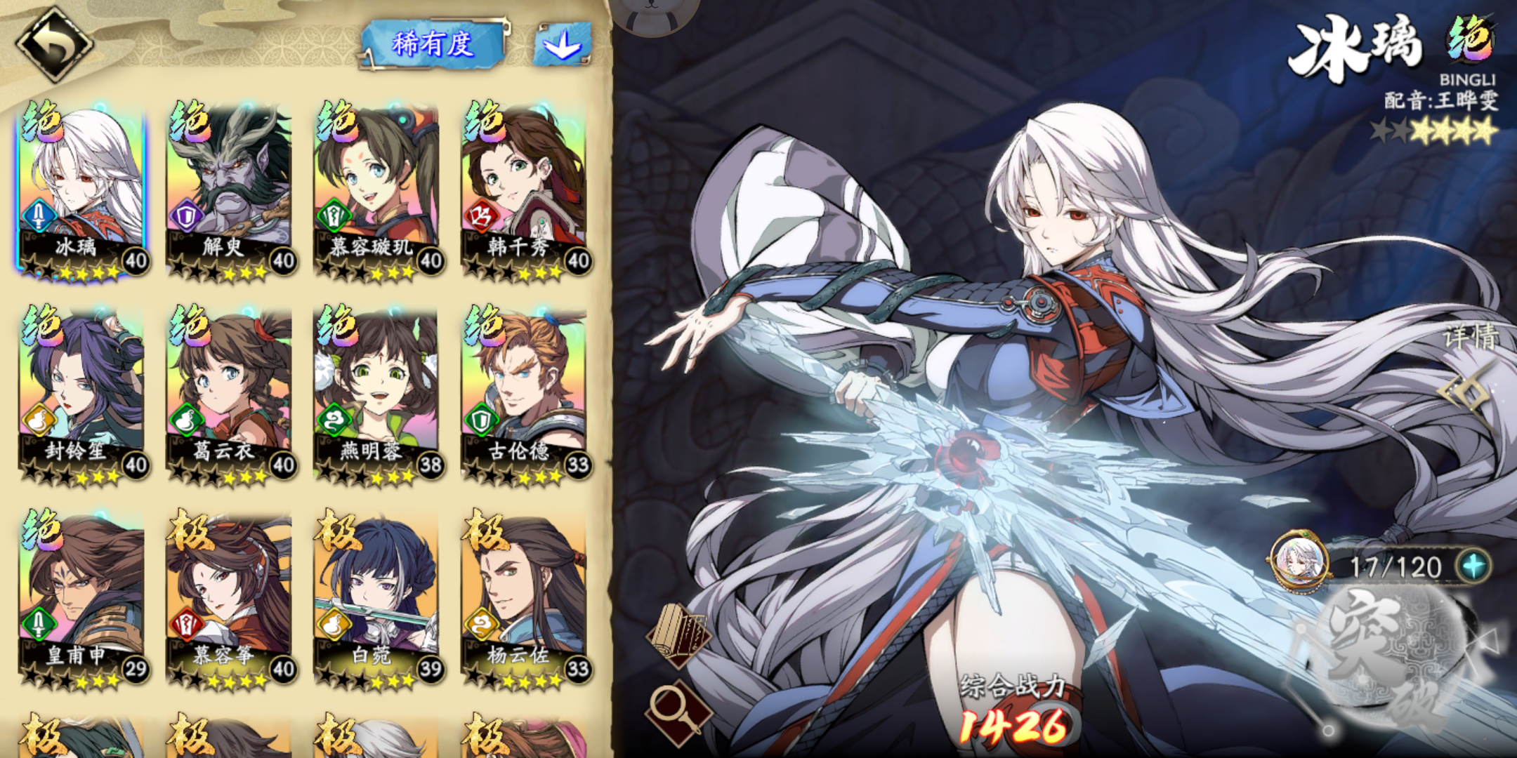 绝品卡差三张,古伦德、韩千秀、阴歙。今天UP池的两个新卡也有了。现在主力培养的冰璃、夏侯、璇玑、封妈、郸阴、殷剑平、封寒月、小燕子。每日三魂4冰璃、3夏侯、2封玲笙。想请大神帮忙规划规划未来培养侧重点与三魂分配。最后就是黄甫申和尉迟良,我之前一直培养尉迟良但今天幻海迷城把黄甫申搞到4星了感觉潜力要比尉迟良大。打冰创绿色队确实少个能增伤的卡,我一直不舍得花蕴石给尉迟良点避实就虚,如今避实就虚的这两块