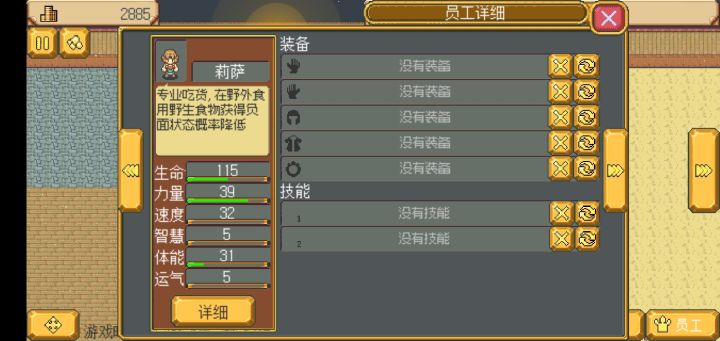 ③[第一阶段]的员工布置,我是按他们的[员工任务]来安排。[莉萨]没有[员工任务],所以没办法扩展技能槽 。并且他的技能槽只有2个,不太适合用来[冒险]。在[第一阶段],[铁砧]的使用次数比较少,所以就把他移动到[铁砧]。[马克]的有一个[员工任务·勇者游戏],所以把他移动到[马],刷属性,方便完成任务。[霍普]的[员工任务·头盔最棒]不用靠刷属性来完成。但霍普有一个比较强的特质,所以移