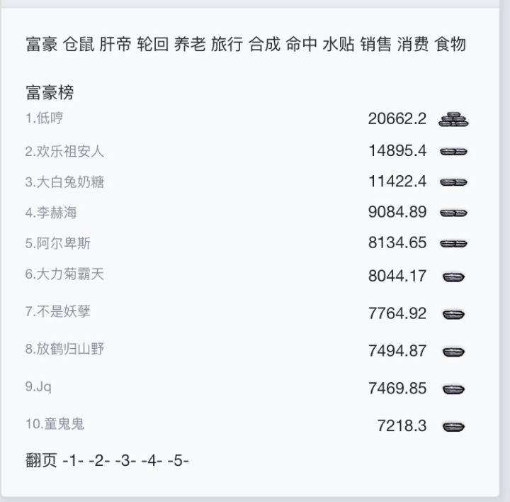 今天是个重要的日子,所以记录一下今日榜单,如果你看得心动了,就快来加入我们吧!富豪榜诸位大佬,钱钱都是怎么赚来的馁!(pls:还有很多隐形富豪哦)仓鼠榜就是叠食榜,我想去榜一家吃饭!诸位都是不锈肝,如果可以请分我一瓣只想劝轮回榜各位好好次饭!从呱呱坠地到白发苍苍,养老榜各位都经历了太多太多来比一比谁跑的又快又远合成得越多肝得越多……论带货能力,销售榜诸位没有服过谁!所以挣得越多,