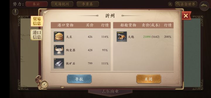 采购大炮的时候有个小窍门,大炮刷到5星后,仓库里先准备一堆武器。然后在港口一次性用采买书把大炮刷到满载的数量,先卖出仓库里的武器,把该港口武器的价格打至70%,一次性买满大炮,然后就向着东(xi)亚(yang)流行的港口奔跑吧。
