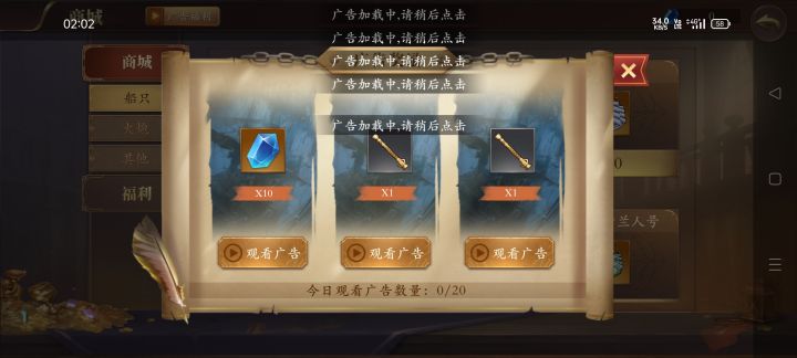 看广告看不了,广告不但自动弹出界面,最后看完直接把大航海界面都关掉,而且不给奖励,两次