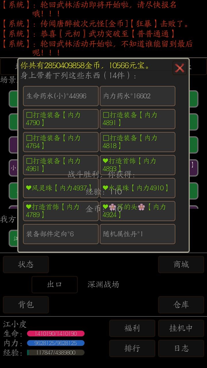 萌新进游戏一定要选全属性,然后挖宝,挖宝,有轮回就打轮回,轮回武林和等级无关,吃鸡游戏,进去开箱子混30个装备可以自杀也可以慢慢玩吃鸡,轮回对于新手来说就是永动机和福利,开一局一个箱子一点肝度值,轮回箱子可以开出装备,技能书等很多东西,对于萌新来说绝对是满满的福利,装备直接金币买,凑5个极品攻击,有元宝了就去商城买蓝色极品,我玩的攻击流,现在五个极品蓝攻,卡2999级,2999可以打呆呆,萌萌和笨