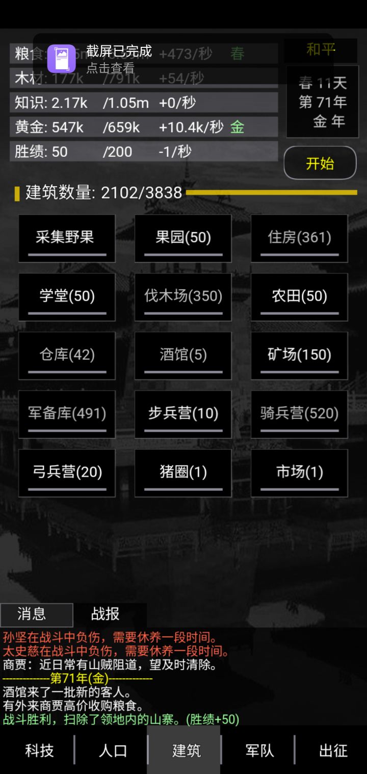 肝了一夜终于肝完了,游戏还算可以。给萌新一点建议还有给游戏一点建议。玩家攻略1. 刚开始没有农民一定要注意食物别到负数否则会人口一直死一直刷新,就卡死了。2资源问题一定要注意主生木头(重要的事情说三遍木头木头木头),众所周知要想富先撸树。3科技在前中时期比较重要所以学堂不需要点很高当然建筑数量后期很多想升也无所谓4果园也不需要点太高1点粮食一秒太鸡肋。5酒馆最高是金人,不知道等级低会不