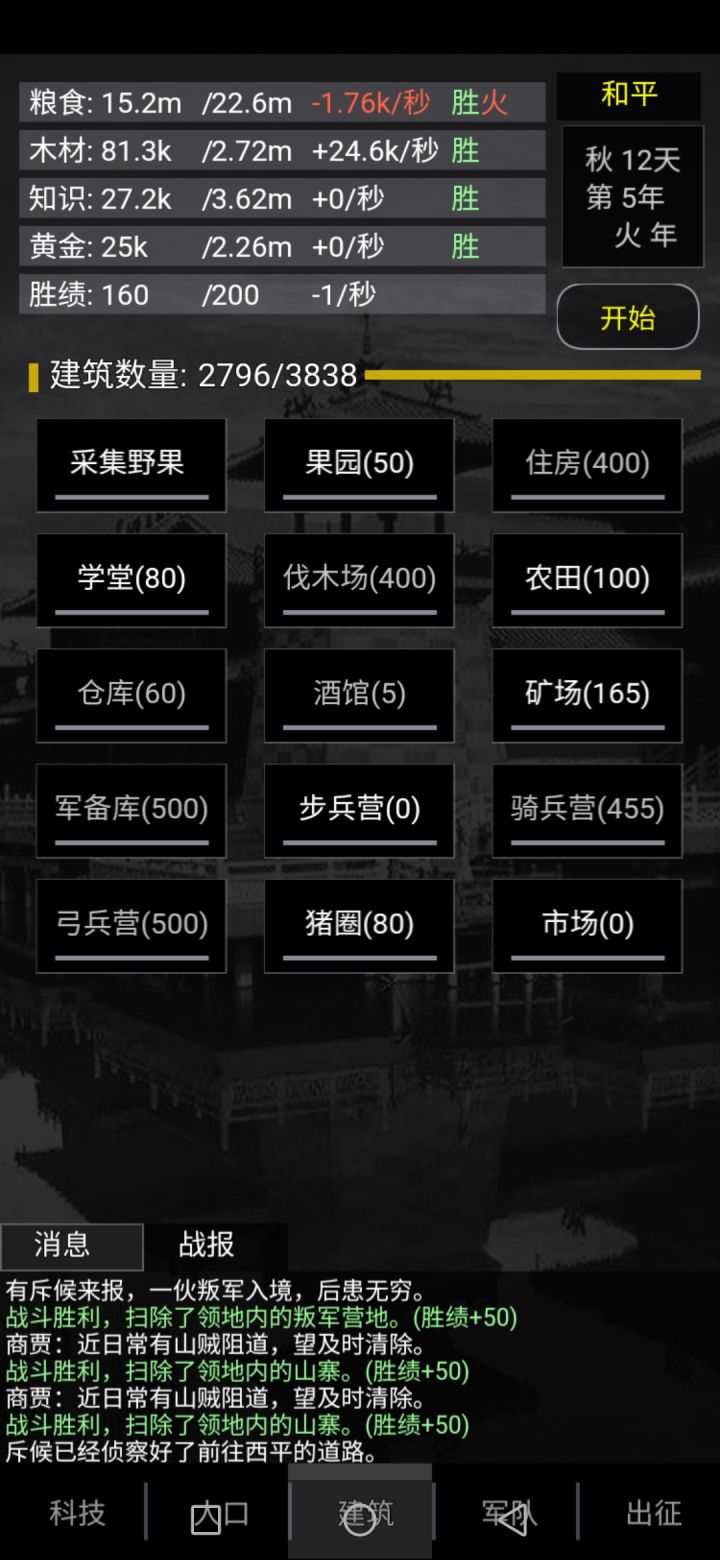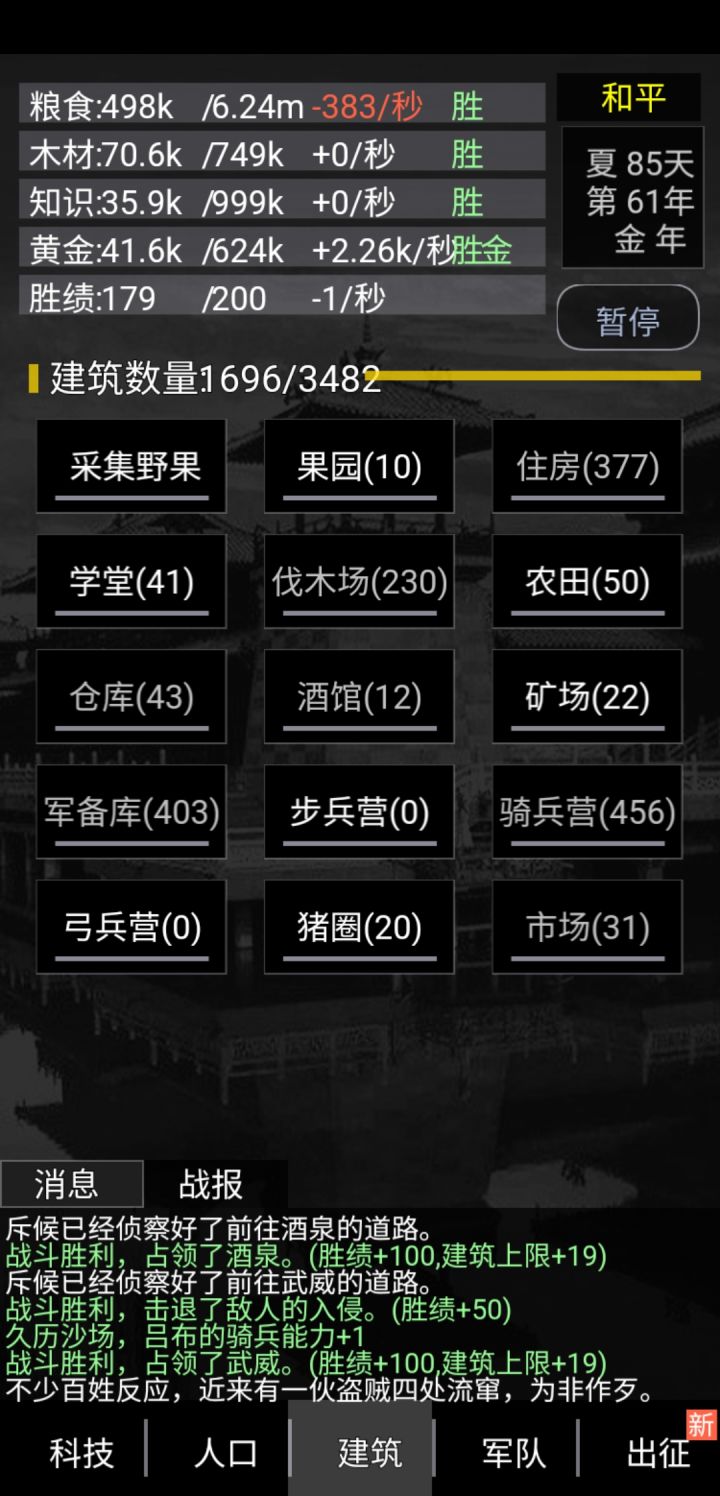 只升级伐木和人口只升级伐木和人口只升级伐木和人口随便玩 到了30年也有1w以上每秒的木材前期多点击粮食 果树升到20-30级 看个人喜好保持粮食不减产就是这么简单 有了木材就有了全世界 这是游戏现阶段的一大瑕疵最后兵种选一个升到300级以上 武将品质都不重要 金色90+900 白色30+900 都没区别了 这也是游戏的一大败笔 武将系统和兵种克制系统都废了以上希望开发者能把游戏做的愈加复杂有趣