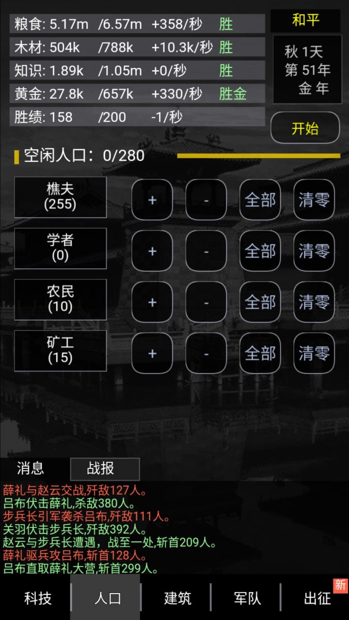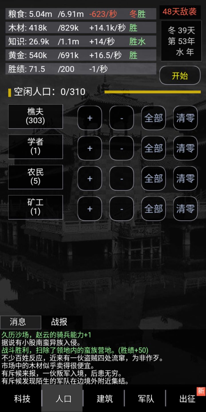 先上图,后期有点无聊,不想打剩下几十座城了。首先,游戏有粮食、木材、知识、黄金四种资源,其中粮食和黄金都是够用就行,木材多多益善,知识用来点科技,点完就没用了。从前期到后期,农民只需要10个就行了,粮食不够了就升级农田。矿工同理,15个左右够用,剩下的都可以当樵夫。学者平时可以没有,轮到水年的时候把所有樵夫拉过去当学者,突击式科研就够了。部队的战斗力取决于军备库等级+兵营等级+武将属性,到后
