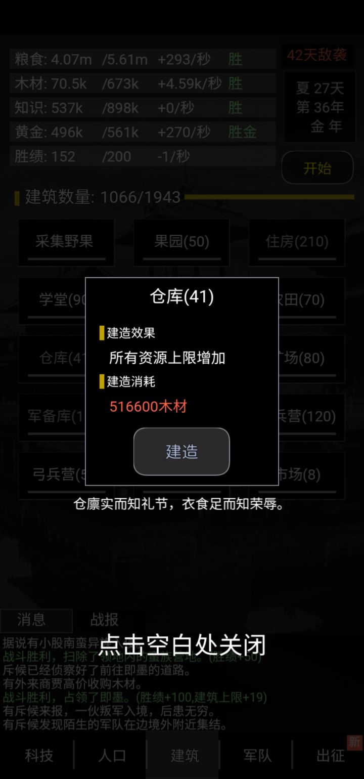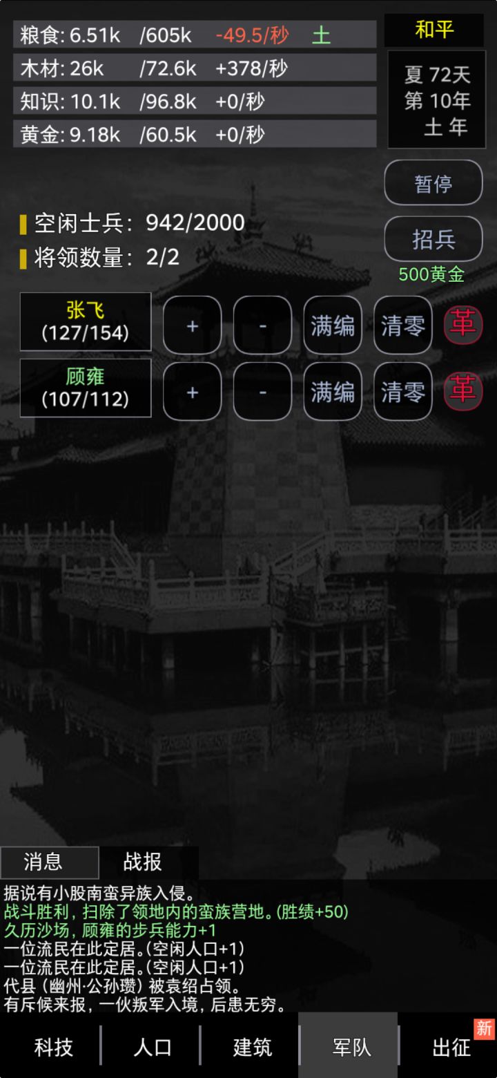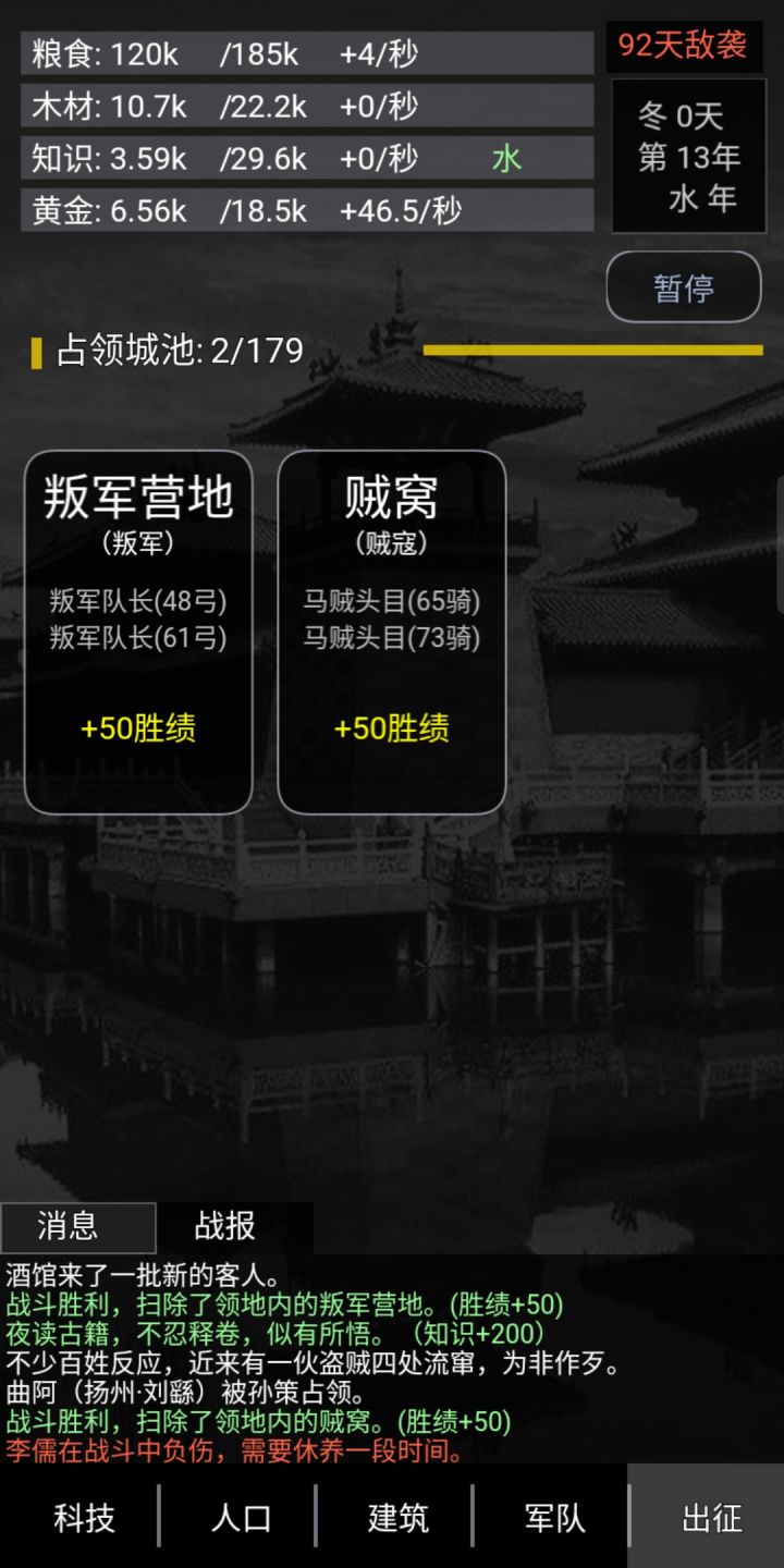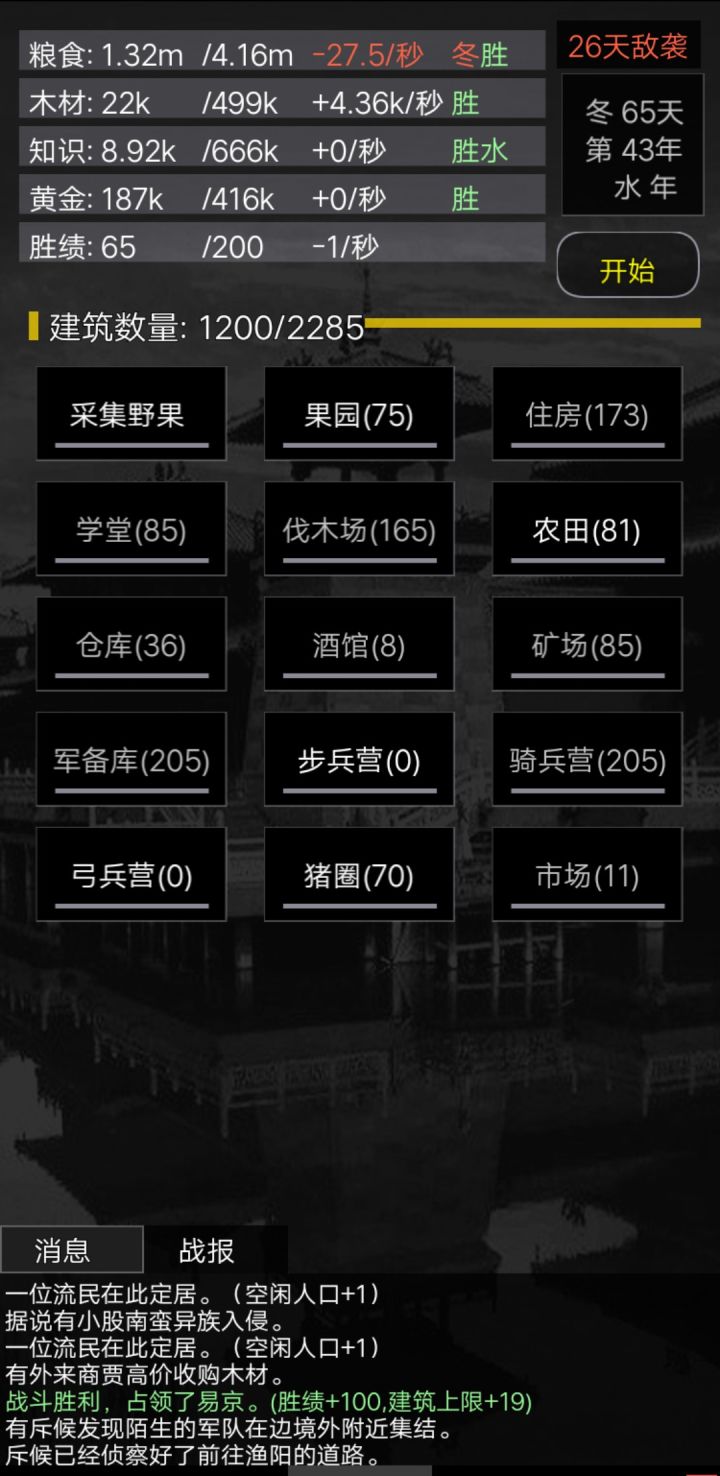 不想肝了,感觉有点无聊,没错我感觉自己已经稳了,希望能增加一点难度,现在只要无脑撸木头再升级军备和骑兵营就能赢,提点建议 ,1.人员可以自由转换,一边今天伐木明天种田后天读书太bug了,建议转换职业时需要消耗黄金和一定的时间2.现在的建筑上限根本不起作用因为基本上不会满,建议适当调低点,然后单个建筑也有上限,不能超过其他很多这种3.增加兵种克制程度,不如战斗时固定优势兵种可以先出手(这样如果