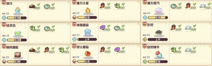 到了中后期,大家金币都充足的情况下,箱庭的升级也该提上日程了,可建材的价格让大家望而生畏,这时候限时任务就登场了。限时委托规则:售卖NPC喜好物品有可能触发限时任务。每次NPC提供的限时任务会有20次上限,单个NPC最多提供五个限时任务。方案:九个栏位分别放置:冰沙,冰霜蘑菇,轻灵药,魔力蒸汽,灰烬,隔热凝胶,魔力火苗,自然精华,燃火蘑菇。时间为三小时,售卖结束大都可以触发两个及两个以上任