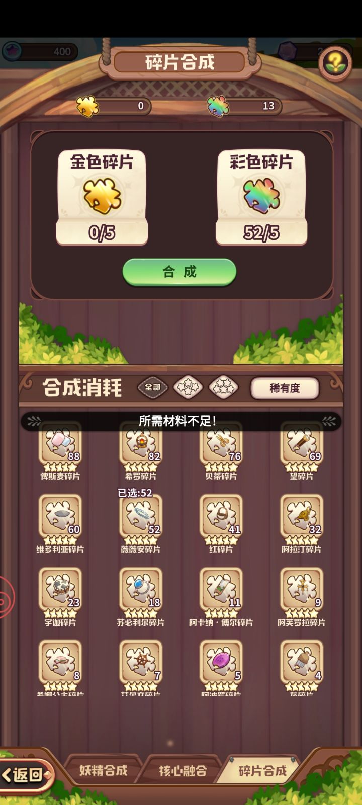 在乐园中新开的功能里的碎片合成功能,有一个需要修复的bug,当提交数量不为5的倍数(每5个人物碎片兑换一个彩色或金色碎片)时,会反馈碎片数量不足的错误提示,例如52个人物碎片可以兑换为10个彩色/金色碎片以及剩余2个无法合成的人物碎片,但实际提交时52个人物碎片都无法合成,并反馈碎片数量不足。#诺弗兰物语 #诺弗兰物语乐园