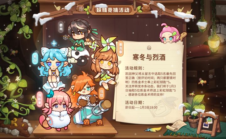 大家好,我是神父凯因这次换我来给大家出题了...琉璃岛的冬天别有一番风情就出个应景的题目吧!下次“轮回召唤”的主题是「寒冬与烈酒」听德拉涅尔说,在下方评论区留言,填写您心中两只妖精的名字就能参加了,祝你好运吧!■活动规则:凯因神父将从留言中选取5名最先回答正确(按评论时间;两只都要猜对哟)的炼金术士奉上彩虹钥匙*5。留言回复本贴,我们将于1月3日抽取5位炼金术师送上彩虹钥匙*5,