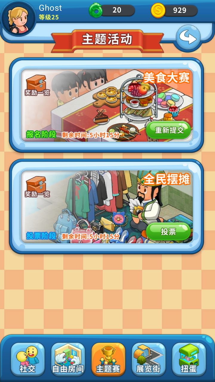 1主题赛刚刚玩游戏 想着重新布置房间参加主题赛 但是却发现没有办法选房间 是我的操作问题嘛 主题赛选择参赛的房间不能更换 我这就很伤了 我弄了一个小时的成果却没有办法参加 还花了好多绿币扩的房间 我现在只能先保存的以后参加 所以我觉得很难受 还有就是主题赛的排名 每个玩家都希望能够随时查看自己的排名 自己得了多少赞 有哪些不足 而不是只是为了获得那个寻宝币去的随意投票2 社交以及刚刚到的社交