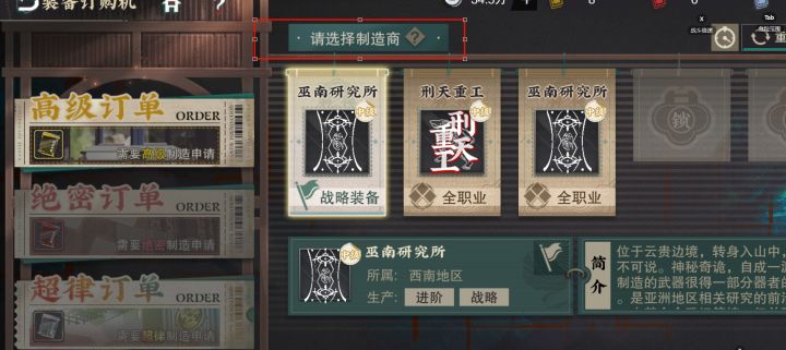 不同的订单, 不同的制造商, 点击 "请选择制造商" 出现的装备都是一样的.但是不同的制造商, 制造出来的装备是不一致的, 这应该是错误的展示