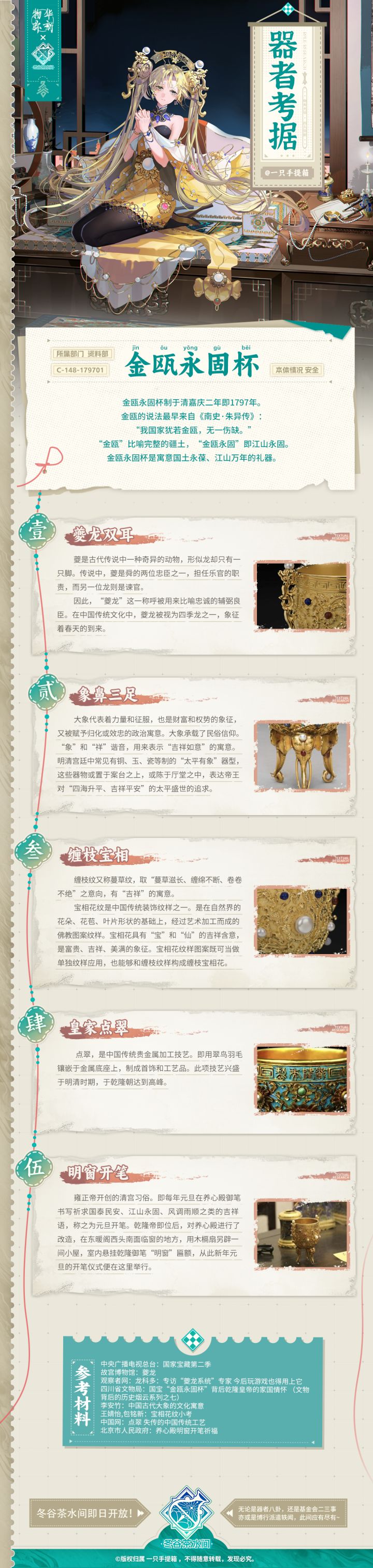 游戏:物华弥新文物考据:金瓯永固杯现藏地:北京故宫博物院类型:金银器年代:清文物介绍:又名清乾隆金嵌宝金瓯永固杯,是清代皇帝每年元旦举行开笔仪式时的专用酒杯,寓意国泰民安,山河永固。杯身镶嵌数十颗硕大珍珠,红、蓝宝石和粉色碧玺,尊贵奢华,被清朝皇家视为珍贵的祖传器物。现知存世“金瓯永固”有四件,伦敦华莱士金杯、鎏金铜杯各一件,两岸故宫金杯各一件。此杯现保存于北京故宫博物院。PS:你们