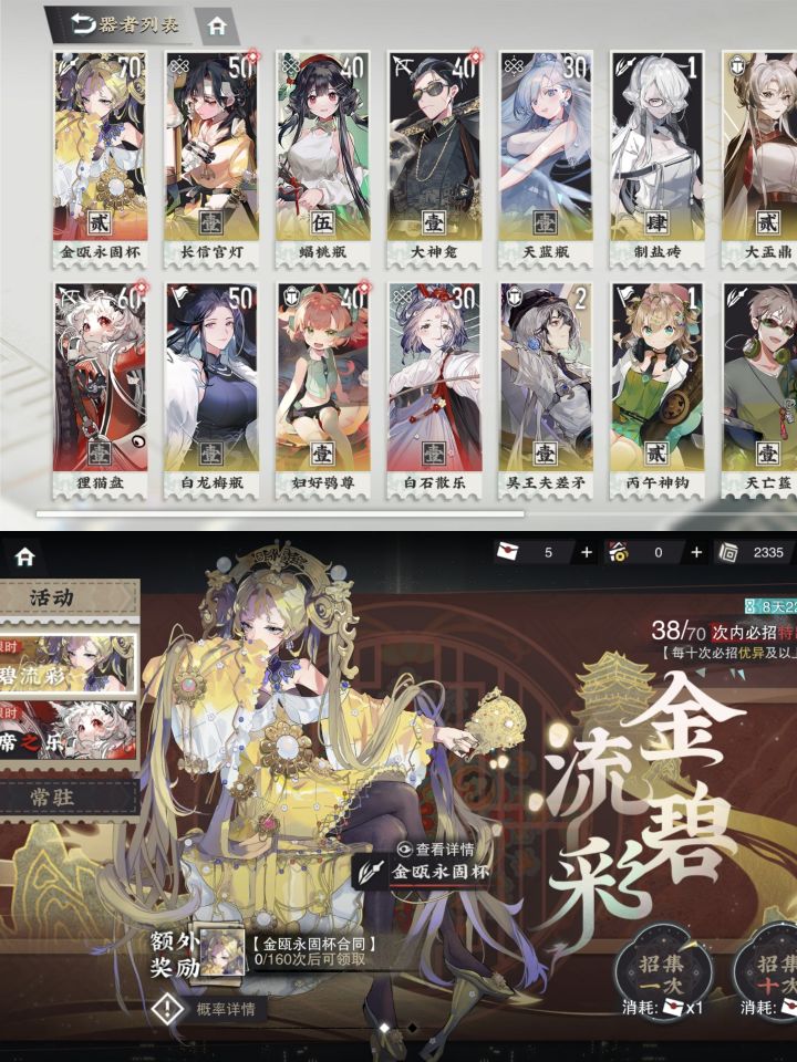 但这差距也太大了吧前面是我自己的号,190抽总共五红,后面是昨天刷出来的初始号,当时是这样的:新手池27抽云雷纹,up池39抽利簋+乳鸽+2金瓯,然后今天打了一下又抽了俩十连,第一次宋金香菱,第二次猫猫盘