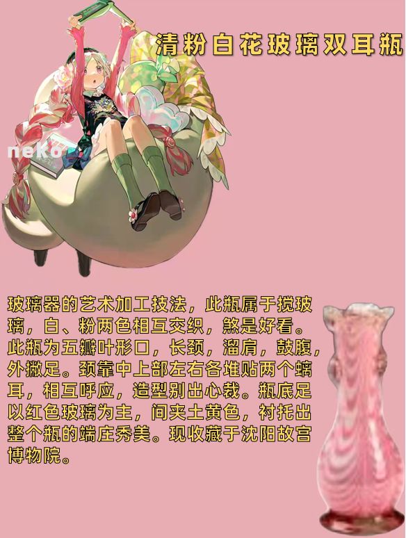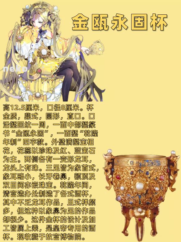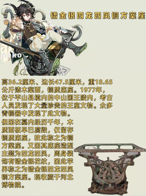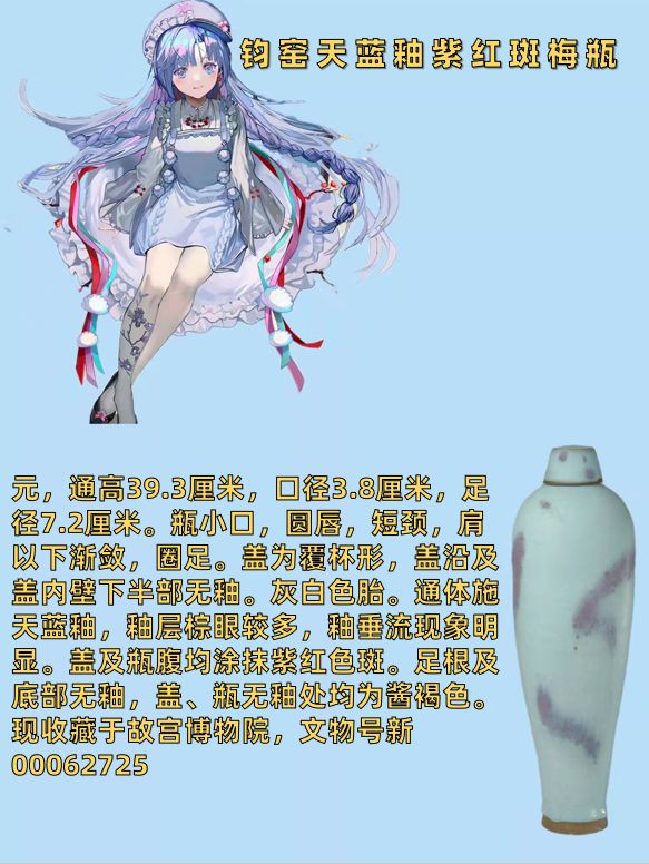 考虑到能让大家短时且便捷了解原物信息,就采用图片形式呈现考据。天蓝瓶有很多种文物,收藏于河南博物馆的汝窑天蓝釉刻花鹅颈瓶和故宫博物院的天蓝釉双龙耳瓶等等,但经过翻阅资料以及官方卡面设定【梅花&幸食】我觉得钧窑天蓝釉紫红斑梅瓶更加符合设定(虽然官方之前有说是汝窑)吴王夫差矛设计真的要夸一夸,非常精细,兵器血槽后端各铸有一个兽头,角色