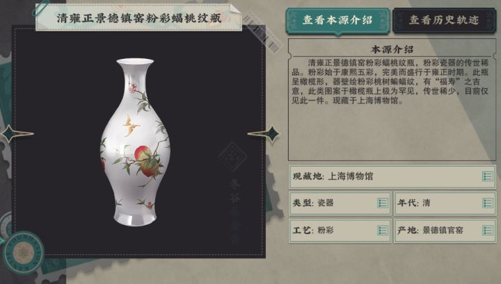 这件**清雍正景德镇窑粉彩蝠桃纹瓶**是一件珍贵的瓷器,制作于清朝雍正年间。现藏于**上海博物馆**¹。以下是关于这件瓷瓶的一些详细介绍:- **形制与尺寸**:这个瓷瓶的形状端庄秀美,侈口、细颈、溜肩、鼓腹,底部略外撇,形似橄榄。它的高度为**39.5厘米**,口径为**10.0厘米**,足径为**12.3厘米**¹。- **装饰特点**:这件瓷瓶以粉彩绘制了八只寿桃和两只蝙蝠,寓意着福寿