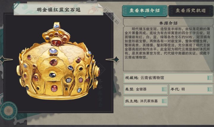 明金镶红蓝宝石冠是一件珍贵的明代文物,具有极高的艺术和历史价值。以下是关于这件宝石冠的详细介绍:- **出土地点**:这件金冠于1963年出土于云南呈贡王家营沐氏家族墓之沐崧夫妇合葬墓¹。- **尺寸与重量**:金冠高11.5厘米,底径11厘米,重320克¹。- **造型特点**:金冠呈半球形,由形似莲花瓣的薄金片,内外四层累叠而成。冠面镶嵌有红、蓝、绿、白等各色宝石50多粒,光芒四射,交相