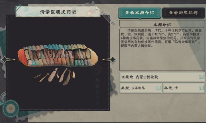 **清蒙医鹿皮药袋**是一件清代文物,通长约107厘米,宽约27厘米。这件药袋的材质包括鹿皮、银和钢。它出土于呼伦贝尔市新巴尔虎旗,内蕴含着丰富的历史和文化内涵¹²。- **药袋结构**:这个长方形的大药袋内插放着34件鹿皮小药袋,这些小药袋内盛放着蒙古传统药物。据文献记载,蒙古药材大约有2200余种,取材于动物、植物和矿物。这些药袋内装有一般常见病所用的成药,并配备了蒙古医生用于放血疗法的放血
