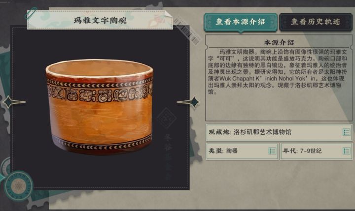 - **出土地点**:玛雅文字陶碗于公元600-800年出土于危地马拉上维拉帕斯、查马或邻近地区²。- **形态特点**:这件陶盒模仿了宇宙结构,其表面可有玛雅宇宙六大神,均为人形和鸟形。长边的中心位置可有铭文,铭文的开头部分可能在盒盖上,但已遗失。陶盒整体看上去形似一座房子或神庙,可被用来存放珍贵的书籍或其他王室物品³。- **文化意义**:这件陶碗上沿饰有图像性很强的玛雅文字“可可”,这说