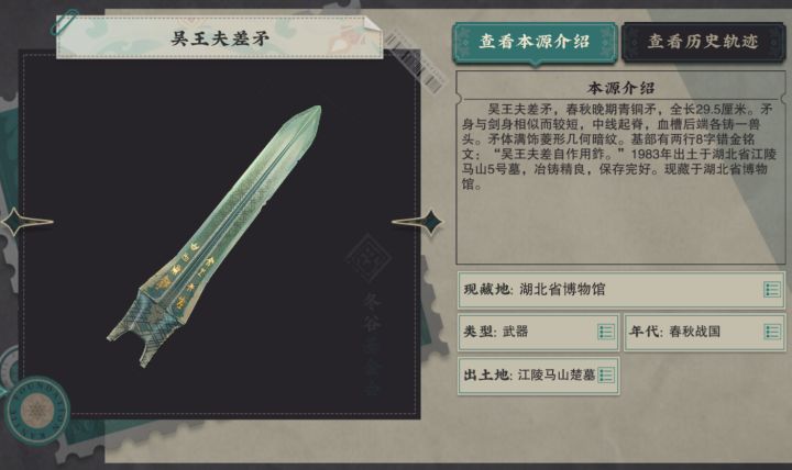 吴王夫差矛是春秋末期吴王夫差的专用兵器,于1983年在湖北省江陵县的马山五号楚墓出土。这件青铜矛的特点和历史价值如下:- **尺寸与形制**:全长29.5厘米,最宽为5.5厘米。矛身两面有黑色暗花,中间起脊,内中空,其中戟成三菱型¹。- **血槽设计**:矛头上有两个血槽,主要功用为减轻矛身重量,同时工字形血槽结构可以强化矛头的强度,让矛头不易弯曲。这一设计让吴王夫差矛在作战时能够反复刺敌和拔