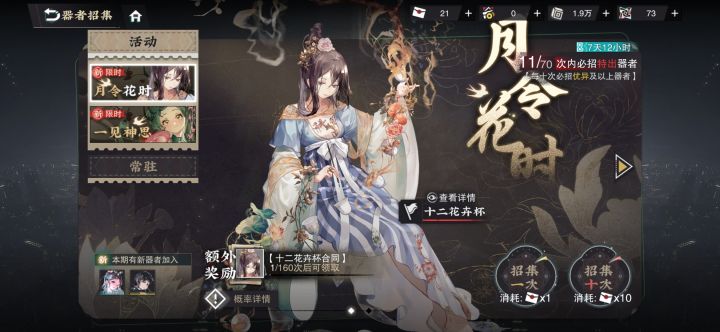 抽洛神赋图双红没歪真不戳十二花卉杯的50抽水位,想着还剩20抽保底了赌一下会不会出十二花卉杯(此时手里只有10抽)然后一抽,哎,出红了(一激动就歪了)然后就去打了下试炼,领了500过来抽,直接一发入魂(可把给我高兴坏了,忘了这个没有大保底,当时就认为十二花卉杯的2致知稳了,哎,她就出了)3致知这不是还有那个红卡嘛,直接换了3张(主线那个送的没达到要求,领不到)