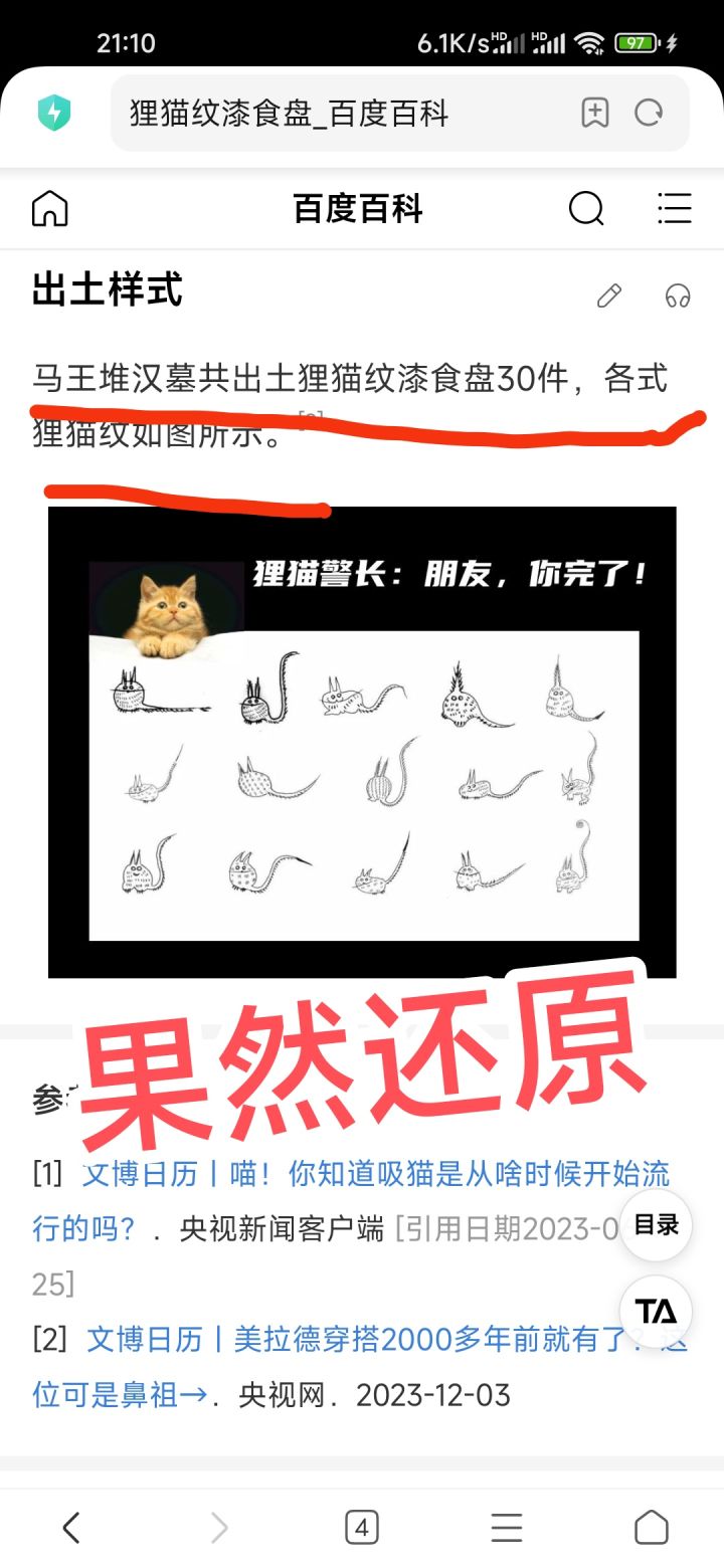 强度在线的开服up射手,人手一个吧?狸猫盘全名【狸猫纹漆食盘】——西汉物品,由考古界非常有名的马王堆汉墓出土出土狸猫纹漆食共30件,各式狸猫纹图案(看起来与人物原画上的小狸猫挺像的,所以西汉就有人吸猫了?🤔)曾登上 如果国宝会说话栏目(图5-6)— —狸猫纹漆食盘的独特之处在于其内外绘制的纹饰。它通体髹黑漆,并在盘内外都写有文字。❗❗❗盘内的文字为“君幸食”,意为请您吃的开心(🧐