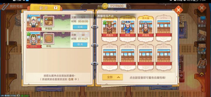 id:171103 账号名称:钢骨问题描述:宅船中养殖场副官实际已生产完毕,但点击完成显示养殖场无产出,也无法重新布置,造成养殖场无法进行正常生产