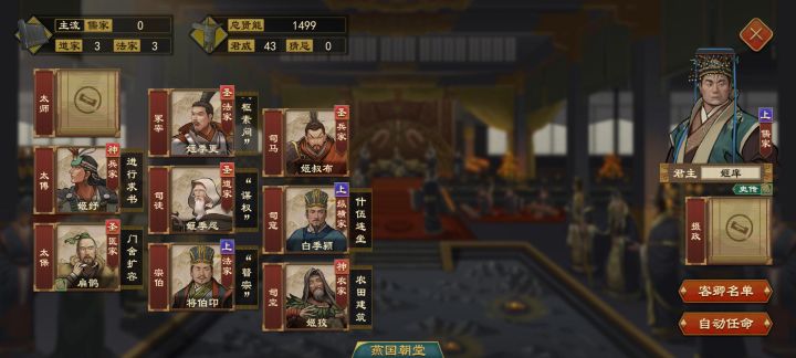 吞并附庸时,若有谍者,会弹出附庸方调查细作之事。我想应该不是附庸方查询吧,而是功成圆满吧?另外谍者在担任敌国都邑大夫时,是否可以献城,这样以免被误杀,或者增加他是我方谍者的显示。其他问题反馈:1.求学问题,大哥,改一下嘛。三年太短了,且三年之期一到就会停止求学,期间如果这个人被自动任命官职,会直接打断的且空窗期太长了。你就不能增加一个政策能力学满后,才停止求学的功能嘛?2.官员任免问题。我