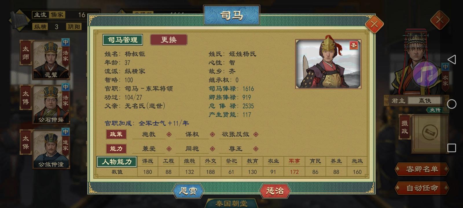 左边可以查看人物政策,但右边没有办法,且右侧有卿族和庶族之分,却没有相关筛选,建议增加详情和筛选。我想城邑大夫的设计就是为了任免人才的吧,那我任免人才后各区域的建设是否应该不需要提示的那么宽泛。未统一就有700多条消息,而且这还是在我有意控制下。侧面反面了此处设计的不合理,诸如减奢靡,增产,城防建设,这些都是没必要提示的。大夫的用处不就是帮我处理这些琐事吗?所以这里建议修改成其他内容,诸如事件提