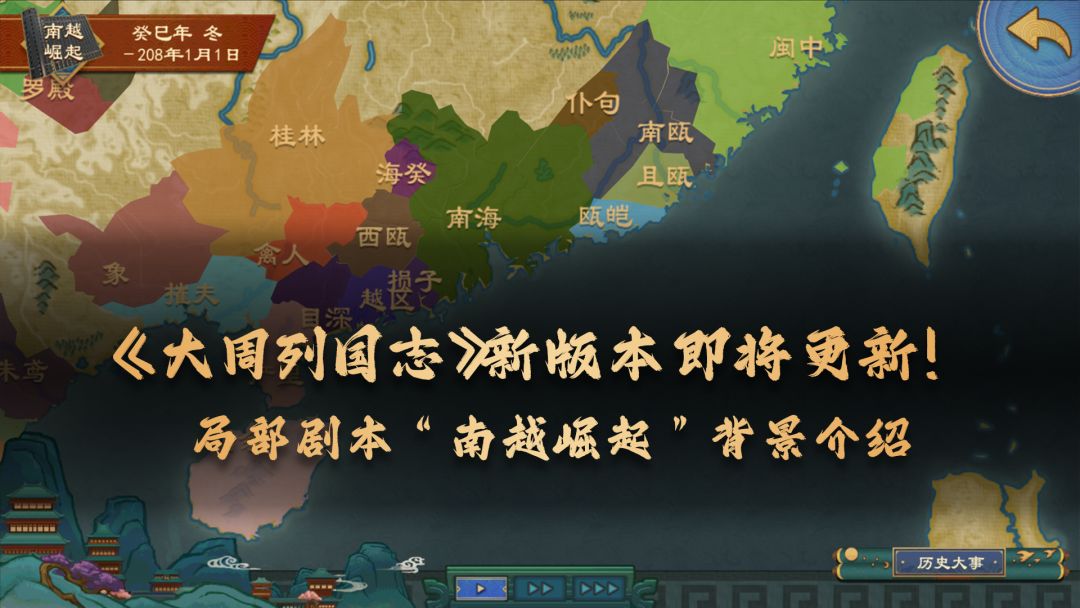 各位君上: 《大周列国志》“虎踞龙盘”版本即将在8月15日进行更新,在新版本中,我们更新了新玩法“争霸模式”和新剧本“局部剧本”,并对文物、流寇、商业等系统进一步拓展,本期视频为大家带来的是新版本中的“局部剧本”模式,以“南越崛起”地图为背景,讲述南越的兴衰历程以及赵佗在岭南地区所书写的传奇故事。 欢迎各位在下方评论区回复您对游戏,或是对本视频的建议与感受。也欢迎各位加入《大周列国志》官方玩家群: