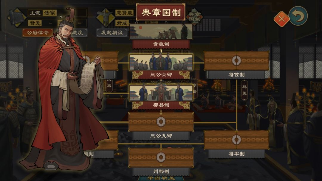 各位君上: 感谢大家的关注与支持,目前开发以及收尾工作仍在有条不紊的进行中,本次为大家带来“秦昭汉烈”版本【典章国制】系统的实机演示及功能介绍。 在新版本中,朝堂内新增【典章国制】功能,通过该功能可对势力各项制度进行改革,制度改革涵盖行政、官职、军府三个方面,改革后可将势力制度转变为郡县制、郡国并行、三公六卿、三公九卿、将佐制等等。 由于【典章国制】系统内容较多,本期视频主要为大家演示郡县制/郡国