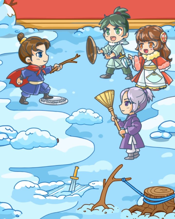 注:我只做解谜关卡里面的解谜。比如找一找某个物品或拼图,我就跳过了扫帚换成折扇,铜护盾换银护盾,刀割断绳子,绳子把剑拉出来,树枝换成剑桌上的物品分别给三个人,女王的丝带是可以拿的,丝带分别给三人,接着打开地图,虎符蓝色,玉佩绿色,折扇紫色有个小眼睛在看,绿色头发禁卫的肩上有梅花镖,梅花镖拖动到小眼睛那里(阅后即焚)燃烧的火把点亮另一个火把,照亮远处的弓箭手拖动剑到女王的裙摆,切出一块布,