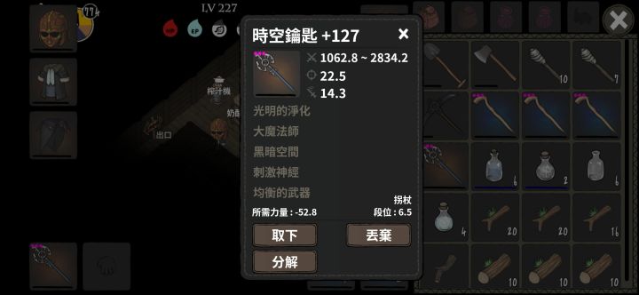 稀里糊涂通关了,如图1、2,最终还是没找到第7本的升级石板,游戏总体而言不错,类似饥荒的RPG回合制。加入的图腾和图纸机制等于需要靠时间积累来慢慢降低游戏难度,提高生存。游戏开局建议人物先活16天,然后故意挂掉,开3图腾插槽。看帖子,很多兄弟都为食物发愁,在此提醒地图中动物、树木、草丛、土里长出的食物蘑菇药材都会刷新,刷新时间未知。箱子、矿石、齿轮等其他不会刷新。每天夜晚出现的影子可以点亮火