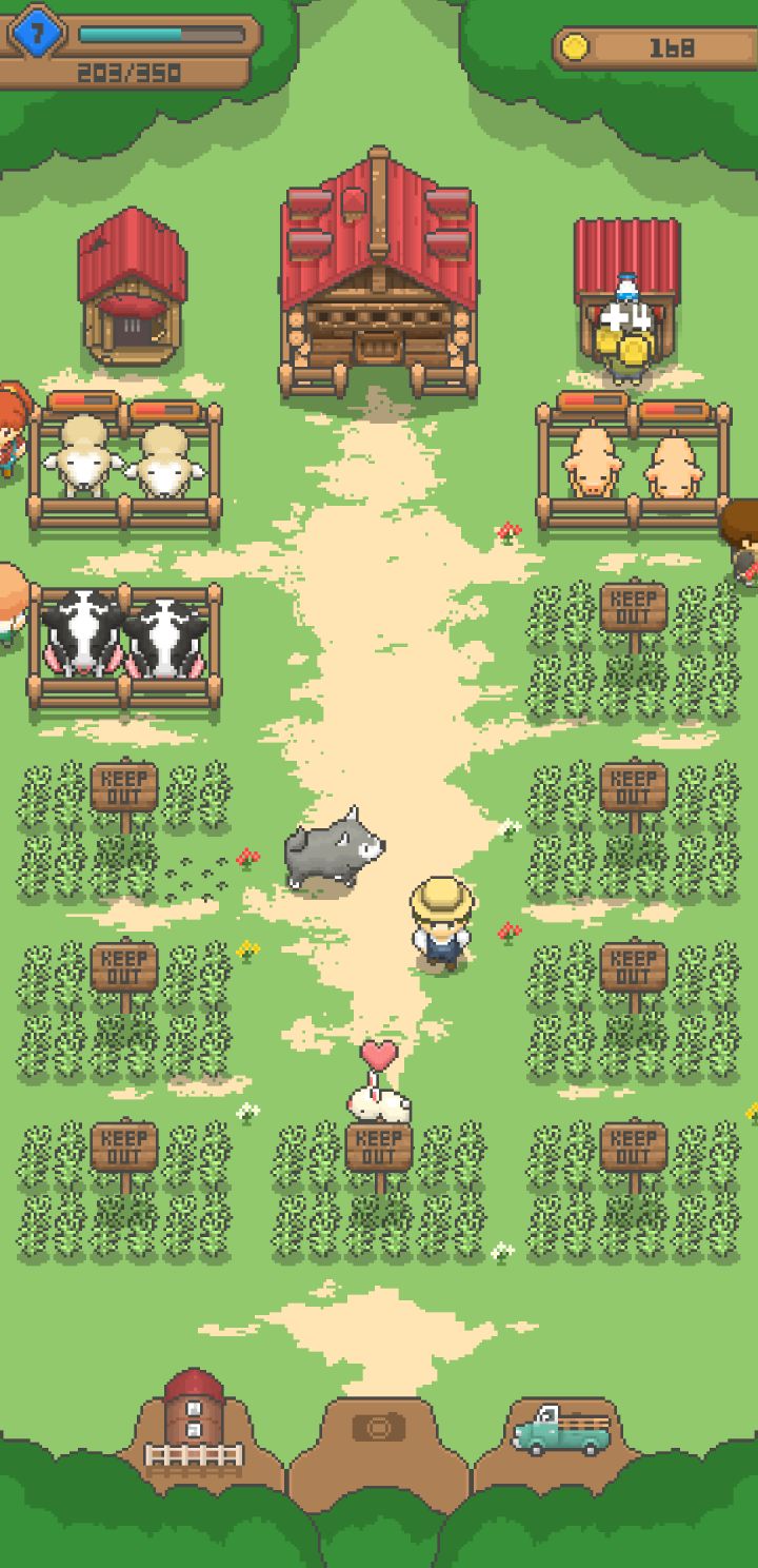 游戏没有文字说明,摸索一个小时功能差不多懂了,看没有人说,总结一下。最上面的三个建筑,从左到右:左:第一个开放的功能为旅店(我还以为是厕所),一个人50G,来人会有铃声提示,点击他才会进入,不点就走了。旅店升级后会开放更多功能,第一次升级解锁电话亭,旅客增加三个。右:从动物身上所得的东西在这里销售,到达指定等级花一定金币扩大售卖栏。中间:农场的升级、放置所在。当售卖栏摆满之后就可以点旁边