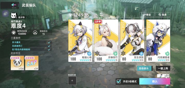 这活动有考虑过中途开始玩的萌新吗?如图,我不知道策划算过没???你自己按图上这个练度算一下,开三倍一把得熊猫币为136×3=408 消耗体力为51,按每天送的10个罐子也就是500体力,加上自身带的满体力150,一共每天算650,我算你700(注意这里是不刷任何其他战力的理想情况下,算我这战力自带12W+零消耗),那么700÷51=13.72549 算你14把。那么能获得的熊猫币就是408×14=5712个 活动时间是14天,也就是说在理想情况下不刷任何东西,还要保持每天有足够的挂机时间能获得5712×14=79968个。而奖励拿满需要129600,这对谁友好?出了开服就开始玩到现在的大佬,没谁能拿满吧??想劝退萌新,让大佬氪金?这算盘也不是这么打的吧???