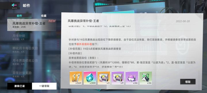 如果我没记错的话王者段位的风暴挑战任务+结算一次有40多k吧,黄金只有20多k,钻石是30多k?本来应该晋级王者了,连拿3个王者段的奖励,现在只能一个黄金一个钻石一个王者,损失。实际上损失和邮箱里补发的差不多刚好相抵,你管着叫补偿? 邮箱里36k,其中24k是所谓的“异常造成的歉意给予的双倍补偿”,我直接好家伙,把原本玩家应得的扣除了,然后补发,就成了双倍“补偿”。 是ch数学不好,还是觉得玩家好糊弄啊