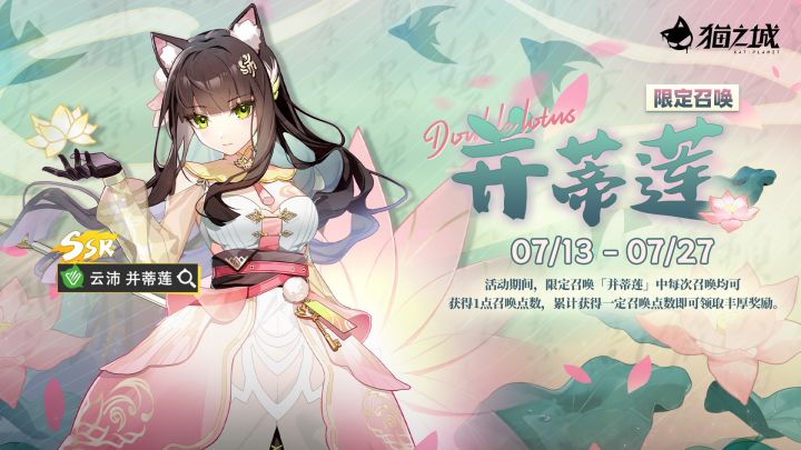 ★限定召唤「并蒂莲」★1. 活动时间2023.07.13维护后~2023.07.27 4:59:592. 活动说明-活动期间,限定召唤「并蒂莲」开启,该限定召唤中以下SSR武装出现概率UP:-「云沛-并蒂莲」(SSR)3. 保底规则-「并蒂莲」召唤中,最多次召唤60次必定可获得SSR武装,该计数通用于所有的限定活动召唤。-当召唤出SSR武装时,有50%的概率为限定UP武装。-当召
