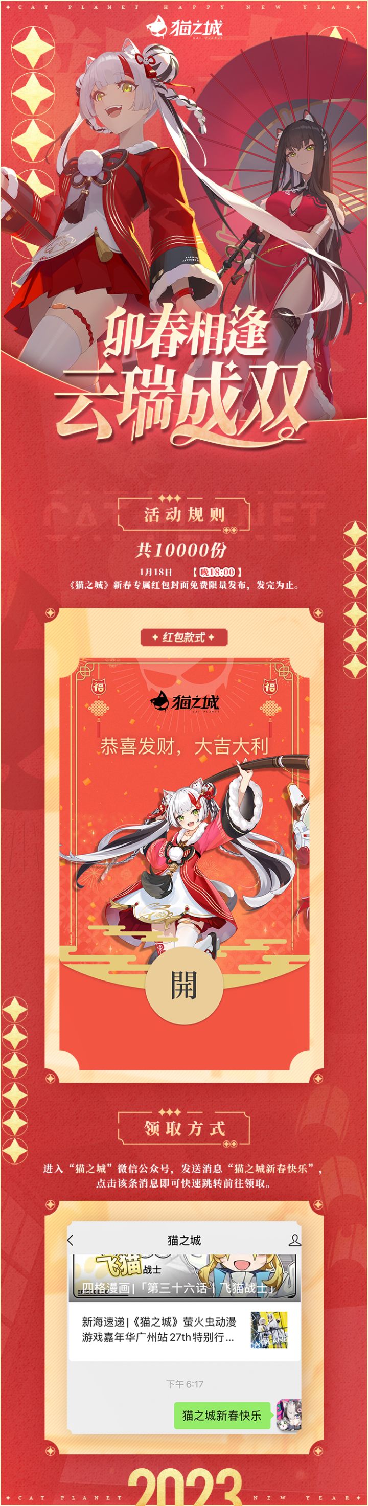 《猫之城》微信专属红包封面发放预告!1月18日,《猫之城》新春专属红包封面免费限量发布! >>活动规则1月18日晚18点,共10000份《猫之城》新春专属红包封面免费限量发布,发完为止。 >>领取方式进入“猫之城”微信公众号,发送消息“猫之城新春快乐”,点击该条消息即可快速跳转前往领取。——————————————☆欢迎调查官入驻《猫之城》!猫咪即正义,情绪即力量!【猫之城】官