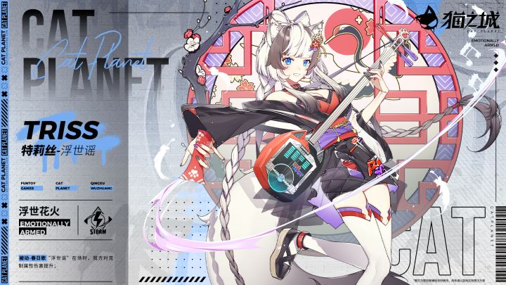 「猫书」签订即将开启【武装档案录入】浮世花火:浮世谣「希望大家能够暂时忘记烦恼,找到新的快乐哦。」换季时阴郁的天气和都市中过快的生活节奏,让情绪病发病率逐节攀升。「早安猫咪」直播节目因此找到特莉丝,希望她能为人们提供一些帮助——被这样鲜明地需要着,特莉丝拿来三味线,为听众们演奏起来,充满古典气息的音色起到了奇异的安抚作用,像是凭空把人们带入了奇幻瑰丽的浮世绘卷。 签订「高级猫书」,可以获得